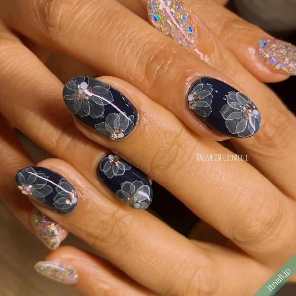 深めのネイビーに白の水彩フラワーがよく映えるデザインは落ち着いた大人の指先に。大きめのオーロララメのワンカラーとストーンで華やかさと遊び心をプラスすれば手元が動くたびにキラキラと輝く高級感のある指先に。via itnail.jp