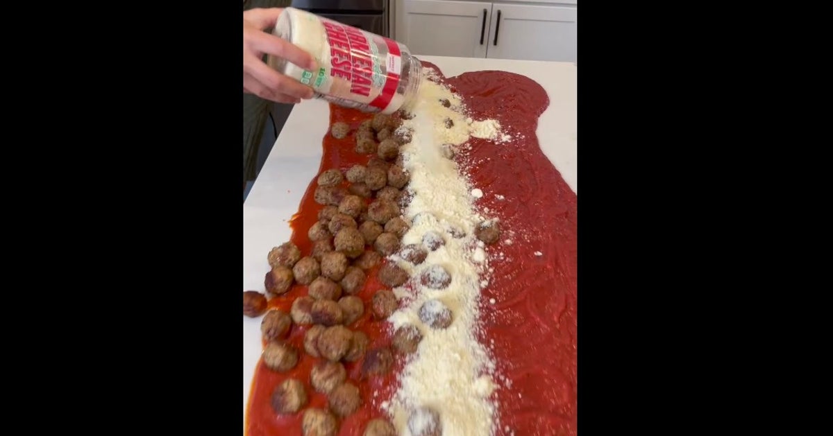 動画のタイトルは「究極のスパゲティトリック!!」で、真っ白なキッチンカウンターの上にパスタソースをぶちまけて、その上にミートボールとチーズ、茹で上がったパスタを乗せる。そして大きな木製のスプーンでかき混ぜる。