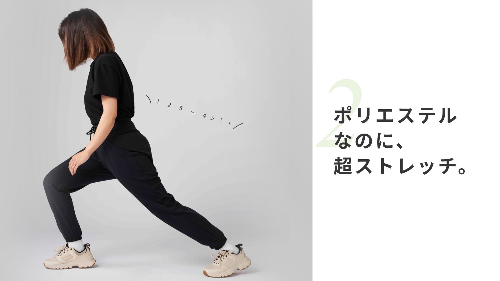 ポリエステル100%にもかかわらず、伸縮性があり、あらゆる動きに対応するストレッチ性とストレスなく着られるフィット感を備えた素材です。