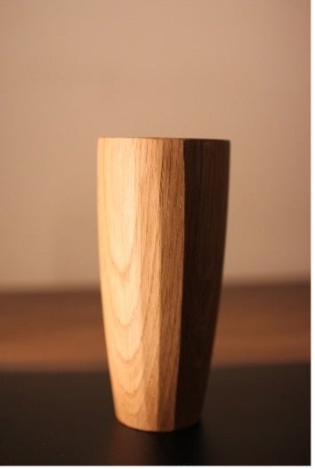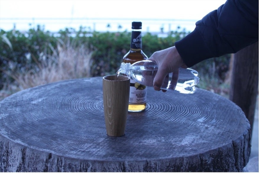 前回のタンブラー同様の素材ミズナラは家具にも重用される木であり、家具工房だからこそのアイデアから生まれたタンブラーです。形状も前回のものは角でしたがハイボール用ということで丸く定番のタンブラーに近づけましたが手仕事の風合いがのこるように削り跡を残してクラフト感を演出してあります。