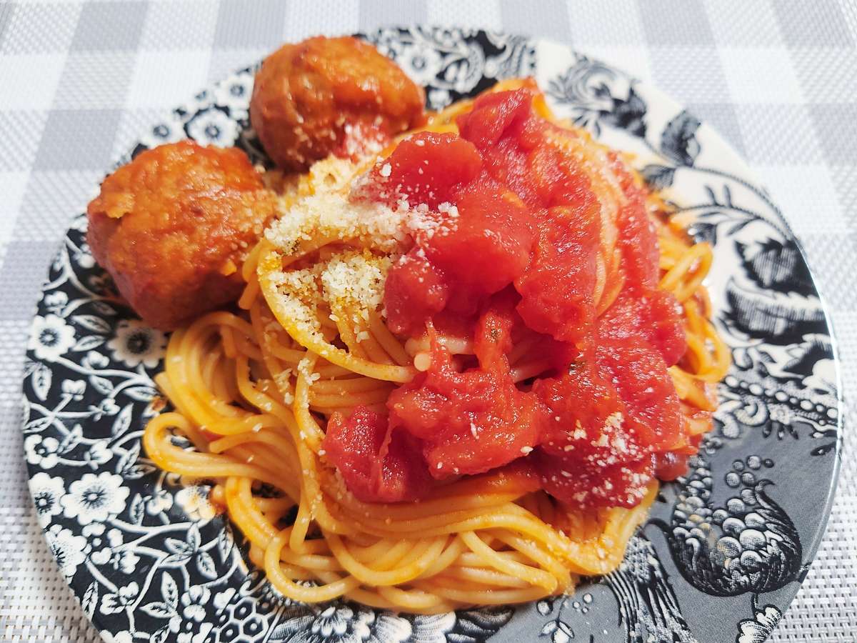 トマト缶にケチャップとミートボールを足すだけで簡単パスタの完成です。