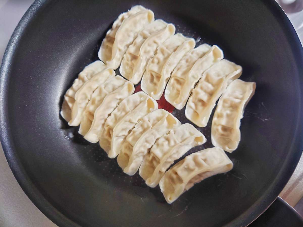 冷凍のまま餃子を並べ、フタして5分焼きます。