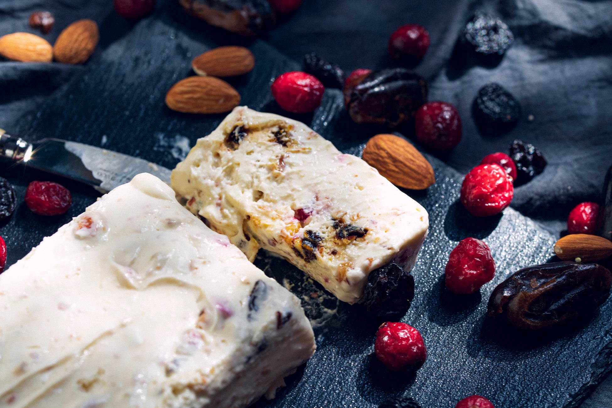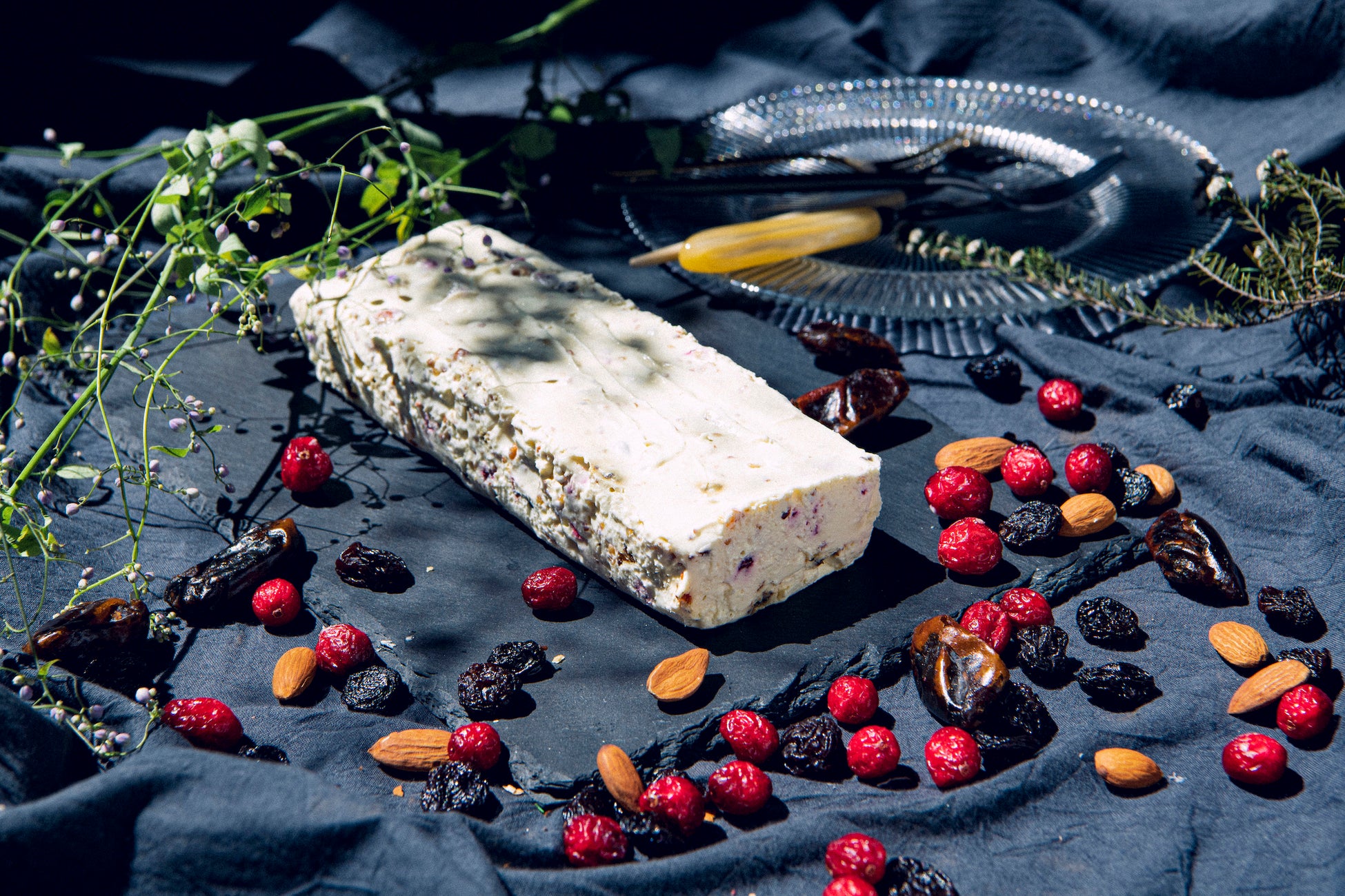 優しい甘さが特徴のスーパーフード【デーツ】、丸まる一粒の食感が楽しめる甘酸っぱい【クランベリー】、ぶどうの旨味が凝縮した大粒の【レーズン】がミックスされたドライフルーツを、ラム酒を効かせたクリームチーズをベースにしたチーズケーキの生地にふんだんに練り込みました。アーモンドのサクサク食感もアクセントに。夏にピッタリの、大人なチーズ〝アイス〟ケーキをお楽しみください!