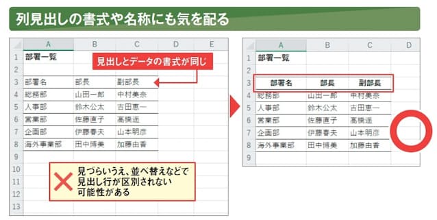 図2 見出し行にはフォントの書式、配置、背景色などの書式を設定する。人が見やすいだけでなく、Excelが見出し行とデータ行を区別しやすいように配慮する複数の列に同じ列見出しを入力するのも、処理対象の列を正確に指定できない問題につながる(図3)。同種のデータでも、番号を付けるなどして、列ごとに固有の見出しを設定しよう。