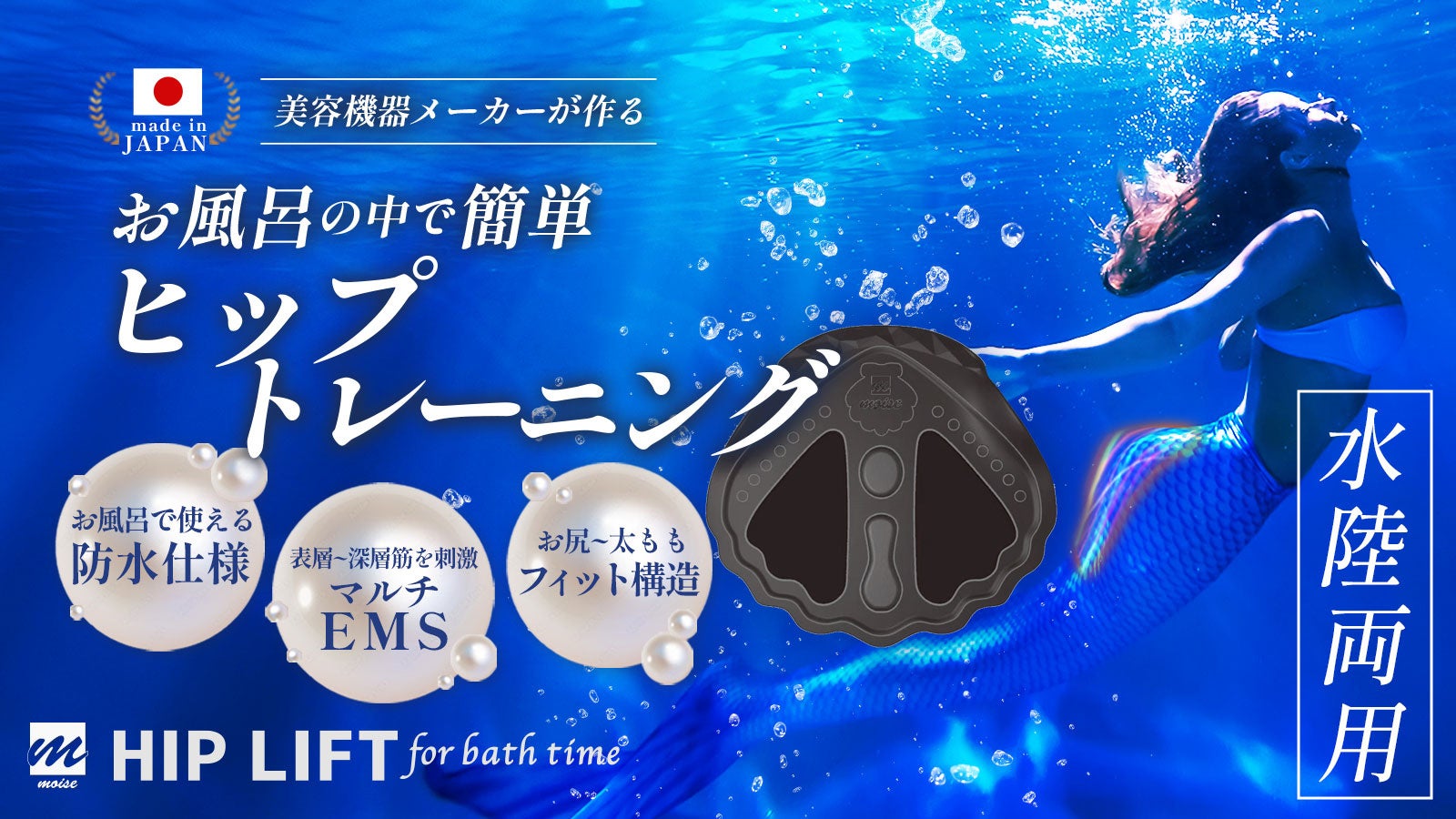 【HIP LIFT for bath time】は日本の業務用美容機器を生産販売するmoise(モイセ)がエステサロンなどで使われ ているマシンの性能を保ちながら『時短』と『続けられるトレーニング』をテーマに開発したEMSマシンです。