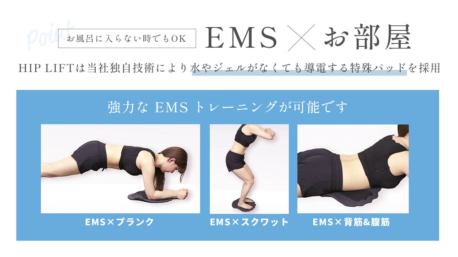独自技術により、水やジェルなしでもEMSが導電するパッドを採用することによりお風呂以外のトレーニング でも使用可能に