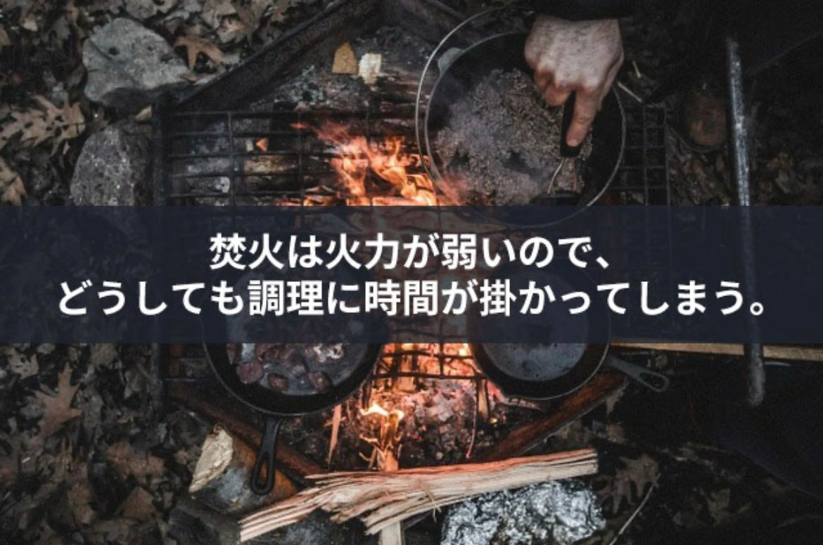 苦労しながら自分で火を起こした焚火で調理すると、同じ料理でも一味違った味わいが楽しめますよね。