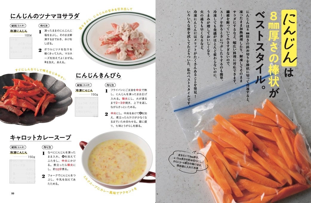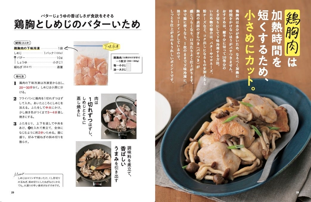 特別な材料や道具を買ってこなくても、すぐにトライできるところがこの下味冷凍の魅力。また本書では、塩と油の冷凍だけでなく「基本調味料で下味冷凍」や「魚介のおいしい冷凍」、野菜の鮮度を長い間キープできる「野菜のそのまんま冷凍」など、冷凍で本当に知っておきたい手法とレシピを144厳選して紹介しています。
