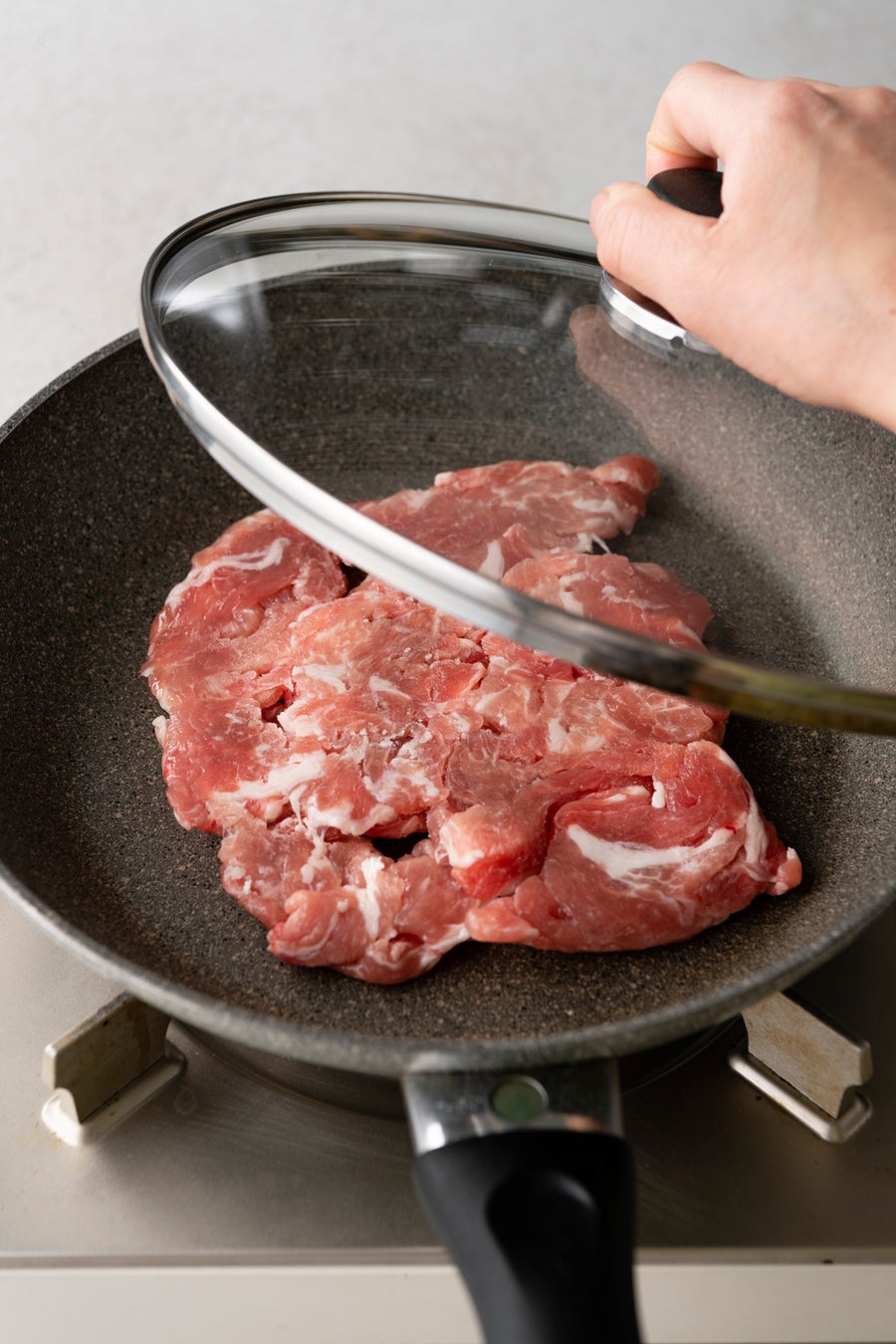 そのままふたをして蒸し焼きにすると全体に蒸気が回ってより早く解凍できます。ほぐれてきたら普通に焼いたり炒めたりして。