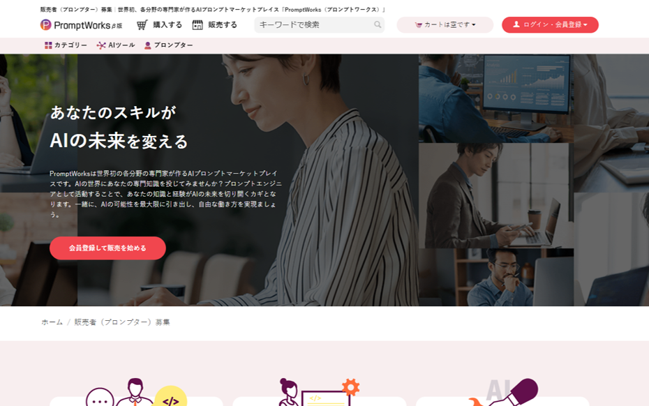 PromptWorks(URL:https://prompt-works.jp/)は、各分野の専門知識を持ったプロンプトエンジニアが作成したプロンプト(AIへの指示文)を購入・販売できるプロンプトマーケットプレイスです。このプラットフォームは、AIを使用する全ての人々と、プロンプトを作成する専門家(プロンプトエンジニア)の間でプロンプトを売買する場を提供致します。