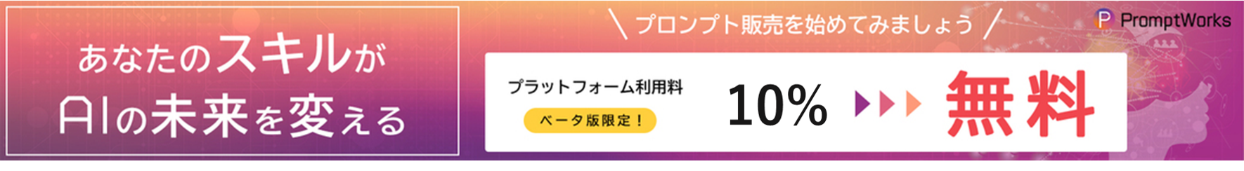 当マーケットプレイスは、現在β版としてリリースされており、皆様のフィードバックを基に最善のユーザー体験を提供するための改善を行っています。β版のテスト期間中は、全てのユーザーに対してプラットフォーム利用料を無料とさせていただきます。この期間をぜひご利用いただき、AIとプロンプトの新たな可能性を体験してみてください。また、ご意見やご感想もお聞かせいただけますと大変助かります。皆様の積極的なご参加をお待ちしております。