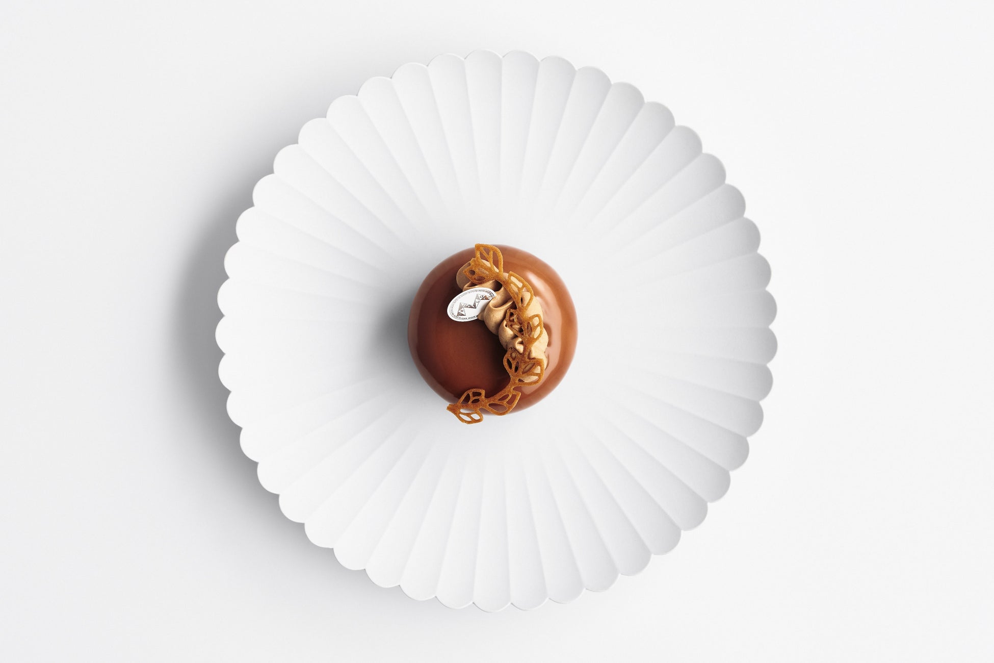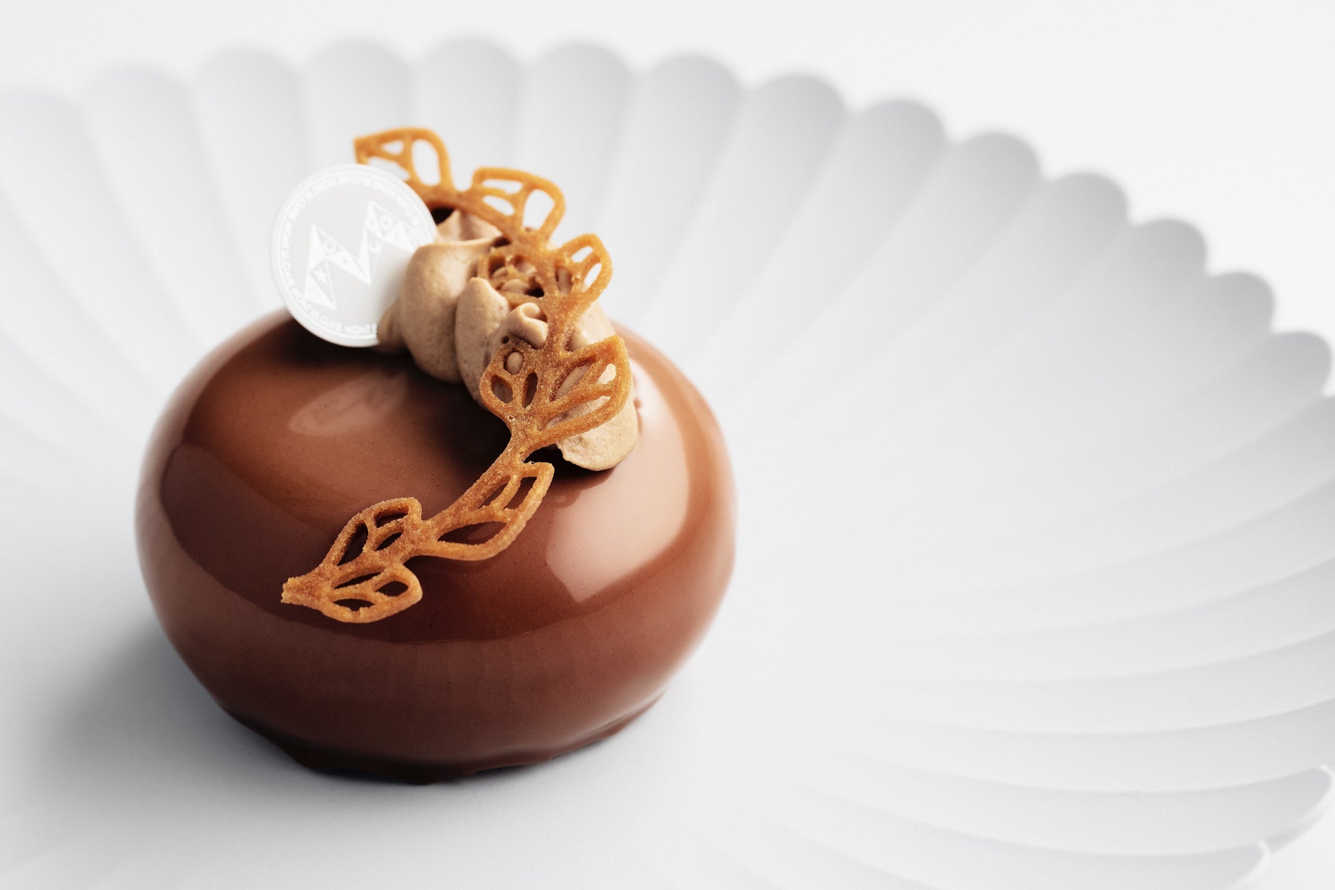 コーヒーやヘーゼルナッツをアクセントに加えたテクスチャーの異なるショコラの層を重ね、センターにはココナッツと相性の良いバナナ、パッションといった南国フルーツのクリームを合わせました。