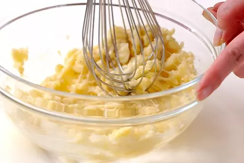 1、ボウルに無塩バターを入れ、グラニュー糖を2~3回に分けて加えながらよくすり混ぜ合わせ、ふんわり白っぽくなったら、溶いた卵を少しずつ加えてしっかり混ぜ合わせる。
