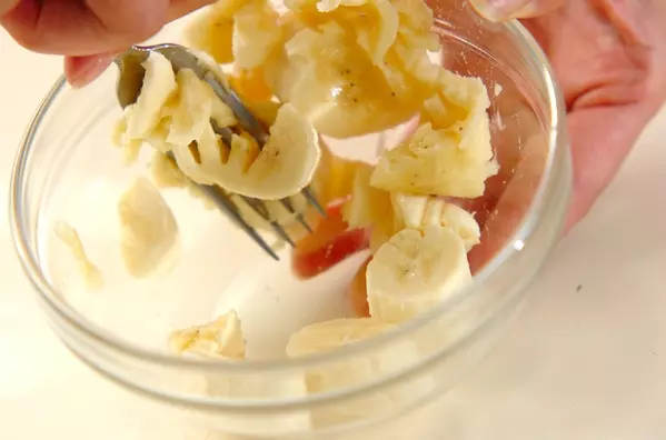 1、バナナは皮をむき、フォークの背でよくつぶす。
