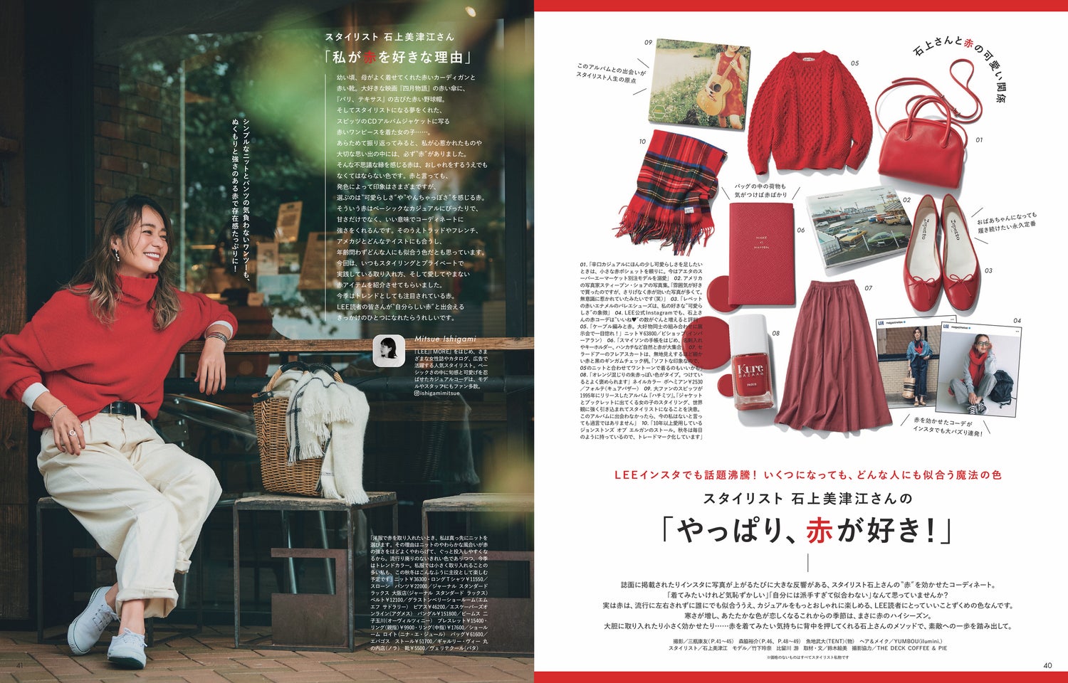 山岸<ファッション特集の場合、スタイリストやライターなど編集スタッフと目指しているのは、コーディネートを真似るための提案だけではなく、”自分だったらどう取り入れよう”“手持ち服の中ならどう合わせられるかな”と、読者が自分のこととしてあれこれ考えを巡らせ楽しんでもらえる内容。正解を提示するのではなく、少し余白を残すことで、自分だけの妄想時間を持ってもらえたらと思っています。忙しい中「LEE」を読んでくださる方のために、“役立つ情報”と“憧れる特集”がバランス良く共存していること、それが「LEE」の目指す雑誌の姿だと思います>